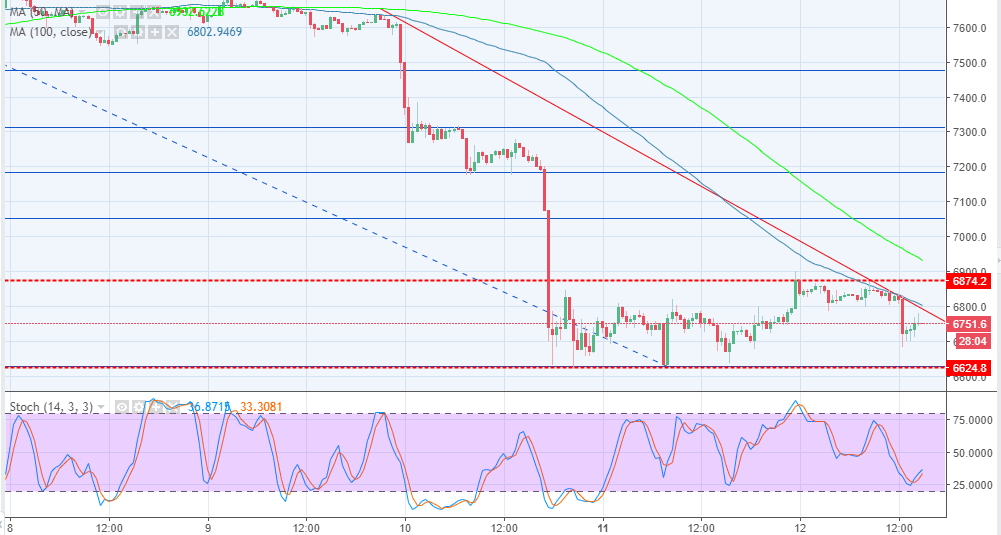 Attempts to break above the descending trendline were thwarted with high selling pressure on Tuesday where BTC/USD rejected a support area at $6,800. The buyers, however, stood their ground slightly above $6,700. Both the 100 SMA and the descending trendline are limiting gains at $6,800 although a bullish momentum is battling to break barriers towards $7,000.