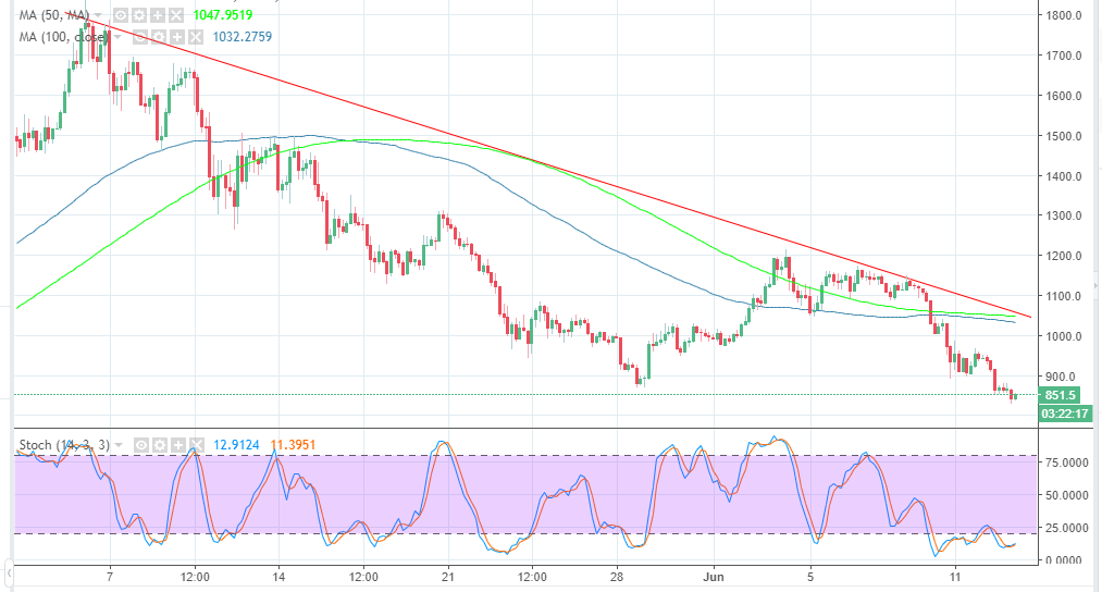 The market is strongly bearish on Wednesday and Bitcoin Cash price has not been spared. The crypto is trading marginally above $850 after a slight recovery from testing the support at $830. BCH/USD embarked on a sole recovery journey breaking barriers from mid-April this and even exchanged hands above $1,800.