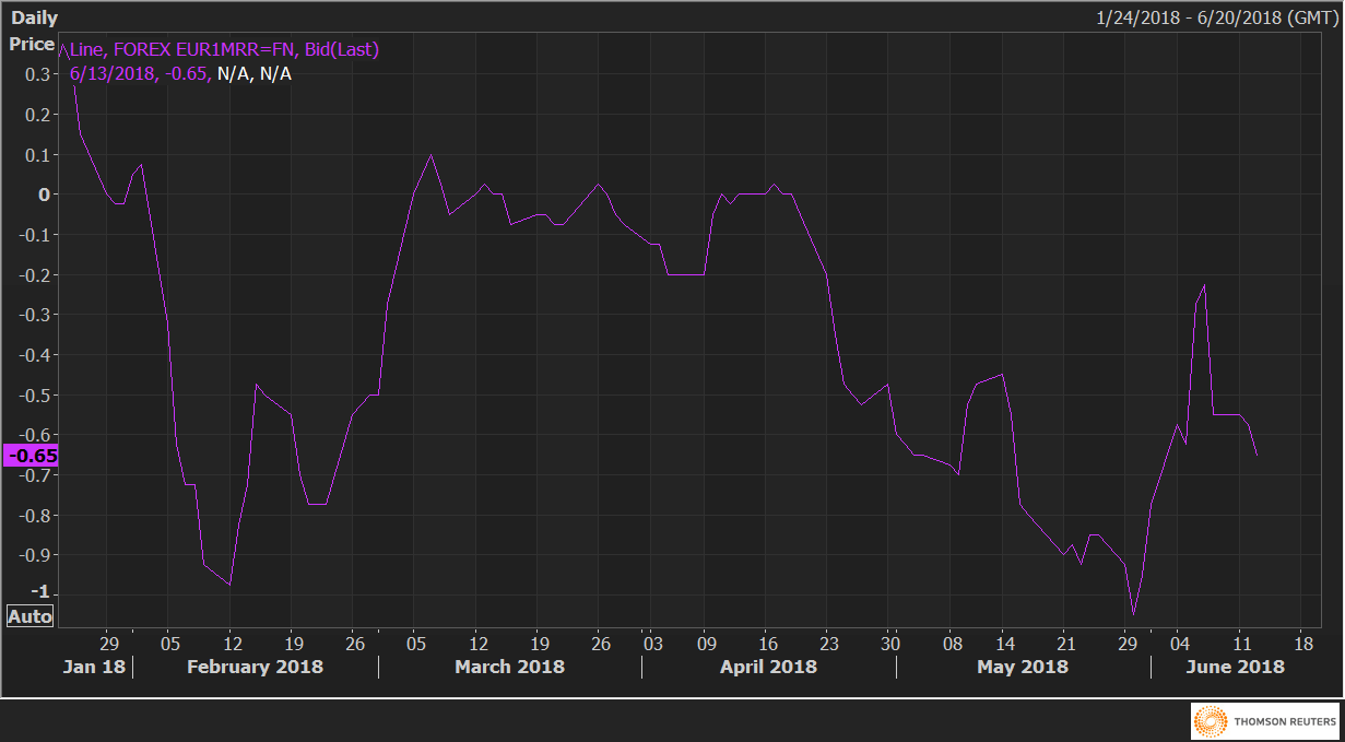 The decline from -0.23 to -0.65 represents rising implied volatility premium for the EUR puts (sell EUR).