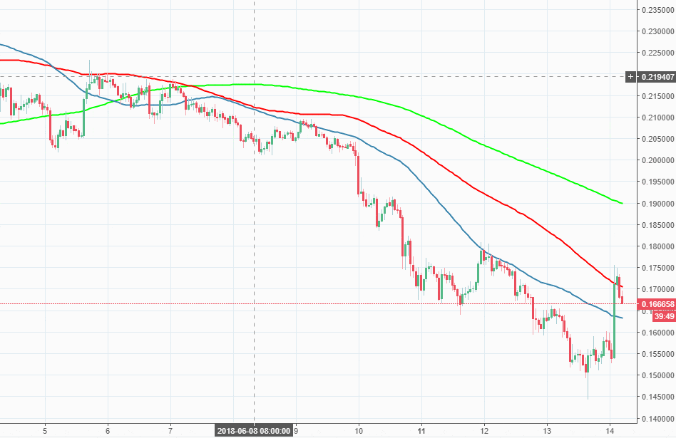 Cardano (ADA) has recovered from the low reached at $0.1443 on Wednesday amid global cryptocurrency carnage. The coin touched $0.1754 during early Asian hours, but could not sustain gains as the upside momentum faded away. Cardano is the seventh biggest cryptocurrency by market value, according to CoinMarketCap, with current capitalization $4.5B. Its daily trading volume spiked significantly from $99M to $166M, emphasizing growing interest towards the coin.