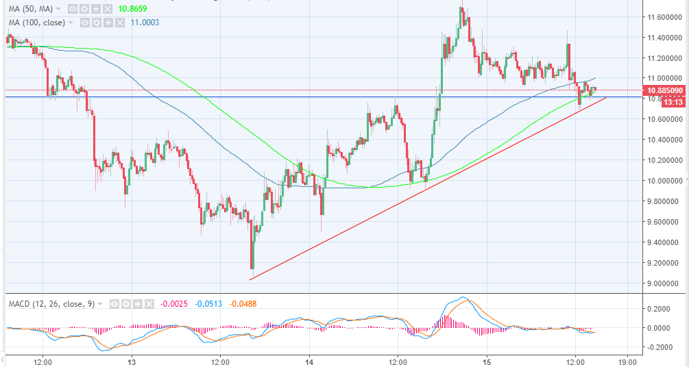 Technically EOS is supported at $11.5 while it is trading below the moving averages. The MACD in the negative region to signal that price will continue being bearish in the near-term. The 100 SMA is preventing gains on the upside, but the former support at $11.2 will open the door for additional gains towards $12.00.