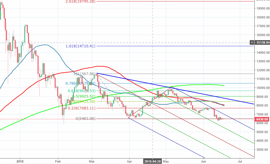 From the longer term perspective, Bitcoin’s recovery momentum has faded away. The price continues to move within the upper channel of downside Andrew’s Pitchfork, $6,900-$7,000 area creating a strong resistance. Once it is cleared, the upside may be extended towards $7,683, which is 23.5% Fibo. On the downside, $6,000 is the key support. A sustainable movement below will open the way towards 2018 low at $5,873 and to the long-term bearish aim at $4,000.