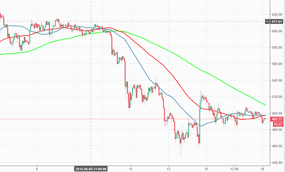 ETH/USD is trading at $493 at the time of writing. After a period of consolidation, the second largest digital coin slipped back below $500.00 handle, which is regarded to be crucial for the extended recovery. It is down 1.5% on daily basis, but mostly unchanged since the beginning of Monday. Current market capitalization is $49.8B and average trading volumes $1.2B, significantly lower Friday’s $1.8B.