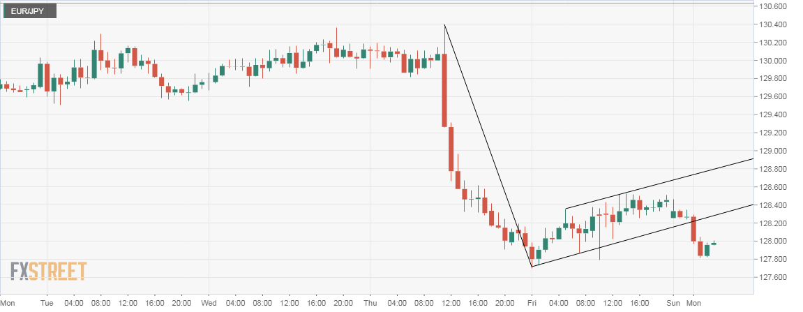 - The EUR/JPY hourly chart shows a bear flag breakdown – a bearish continuation pattern, which indicates the sell-off from the high of 130.36 has resumed.