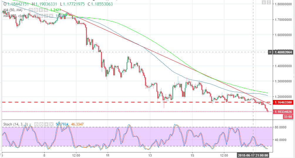 The price is battling to find a short-term support above $1.1, besides technical indicators signal that further lower corrections could explore the range below $1.00. The stochastic indicator is deep into the oversold levels (9%), moreover, it is in a generally downward direction. The gap between the Simple Moving Averages has begun widening signaling that bear pressure will dominate in the medium-term.