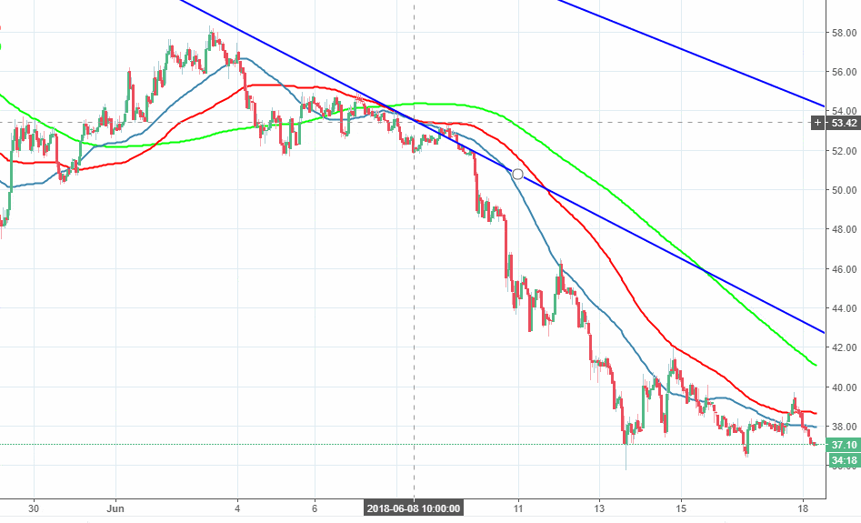 NEO is now 12th digital coin with a market cap $2.4B. It is changing hands at $37.16, down 3.3% since the beginning of the day. The coin touched $35.73 low on June 13 and has been trading with bearish bias since that time, despite a short-term recovery.