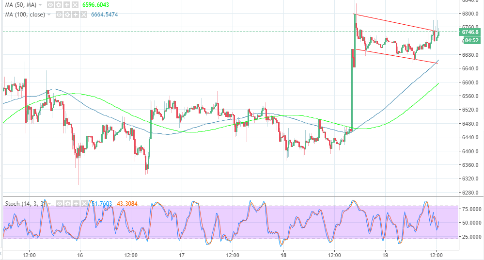 Bitcoin Cash is busking in the light of bullish trend is sweeping across the market. The battered Bulls defied the bear and employed the critical support at $6,400 surging past the key resistance at $6,600 and $6,700 respectively. BTC/USD is trading a bullish flag pattern supported by the 100 SMA pending another upside breakout.