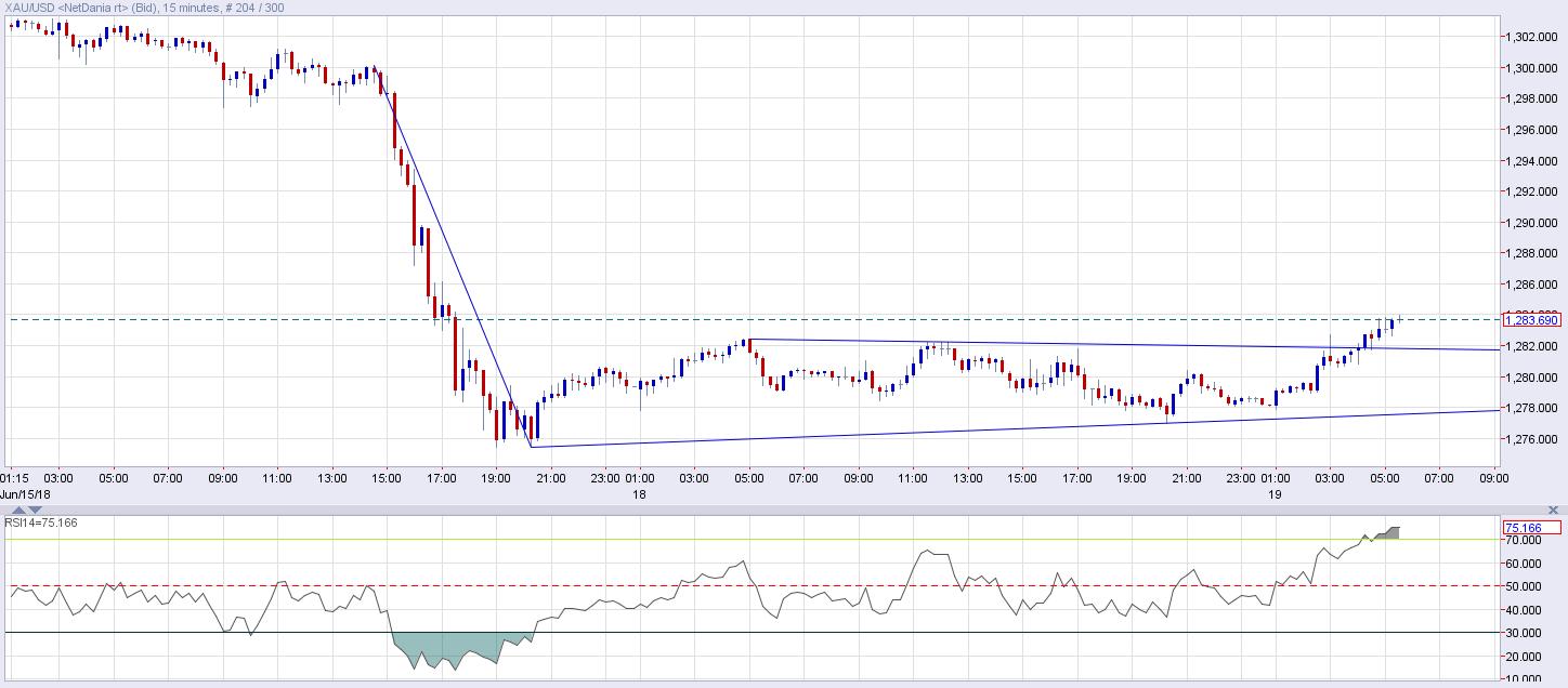 - The 15-minute chart shows gold (XAU/USD) has ended consolidation with an upside break (bullish breakout).