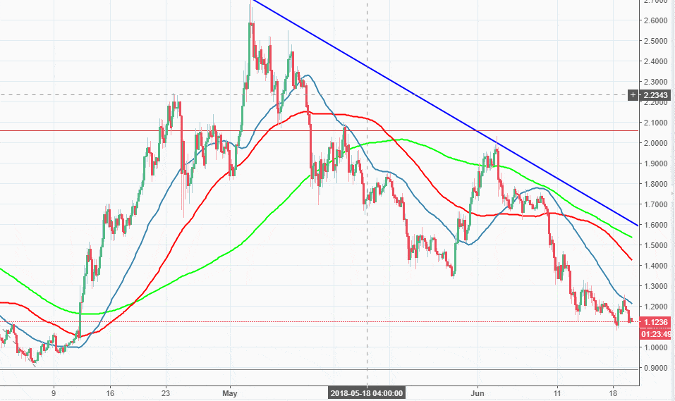 IOTA is trading with a downside bias, being dangerously close to critical $1.00 handle. The coin is down 5.5% on daily basis amid general sell-off on the cryptocurrency market. IOTA’s market value has reached $3.1B, while the average trading value is registered at $73M. Over 50% of all IOTA-related transactions are processed by Binance. IOT/USD is currently changing hands at $1.12