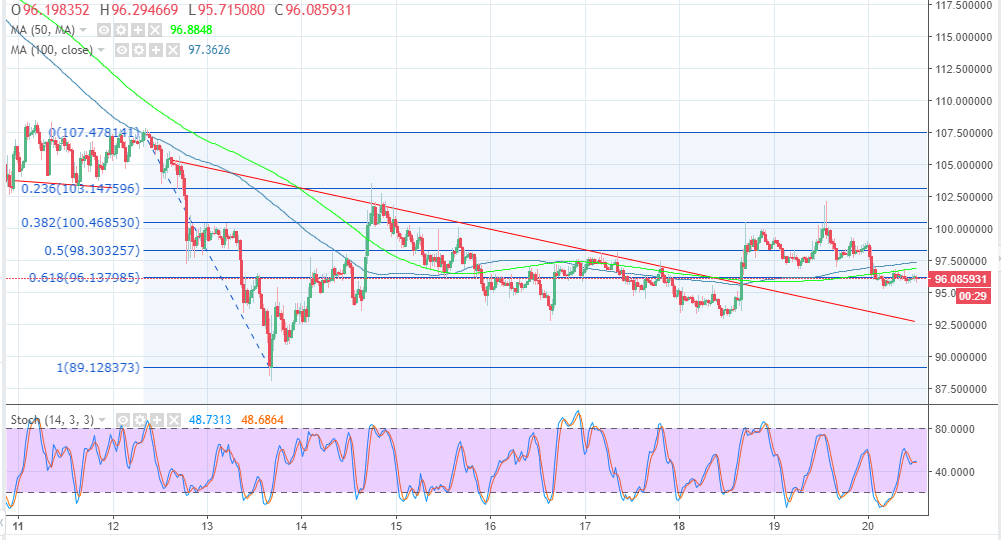 Litecoin price upside is currently limited by the 50% Fib retracement level with the previous swing high of 107 and a low $89.2. The 50 SMA and the 100 SMA on the 30′ minutes chart will also prevent gains towards the short-term resistance at $99.00 respectively. However, the critical resistance and current upper supply zone is at $100.00. An upside breakout is also expected which could have LTC/USD attack the serial resistance at $102; the stochastic on the same chart shows bullish signs. Other support areas on the lower side include $92.5 and $89.2 (previous low).