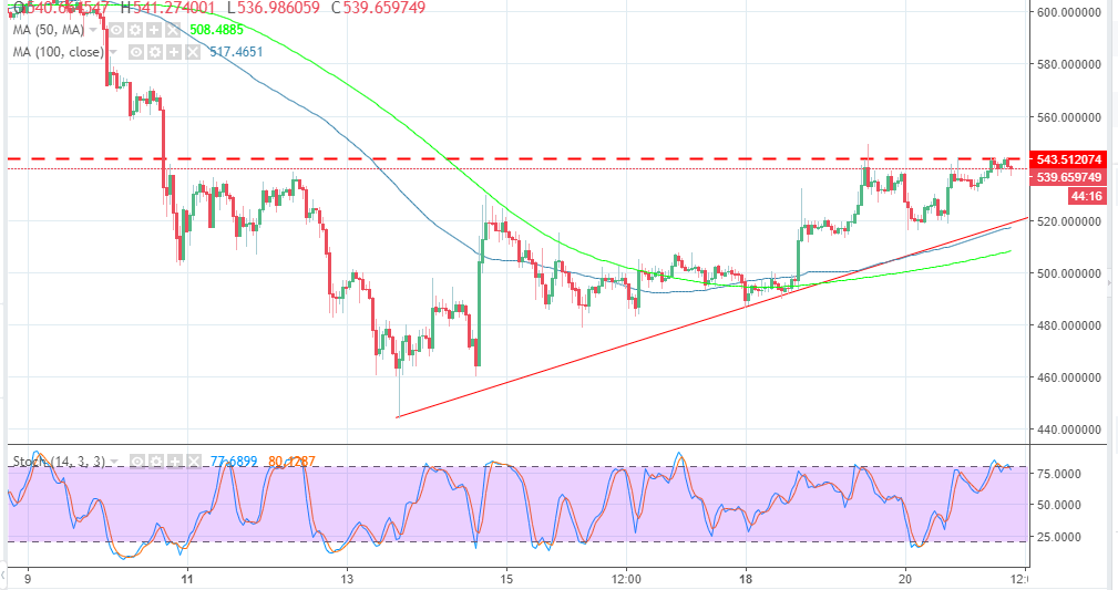 The recent overarching declines had ETH/USD trading in the $460 range. However, the buyers entered and the crypto has sustained an uptrend breaking above the resistance at $480, $520 and $530 respectively. The buyers breached another short-term resistance at $540 but selling pressure on Thursday has pushed for lower corrections.