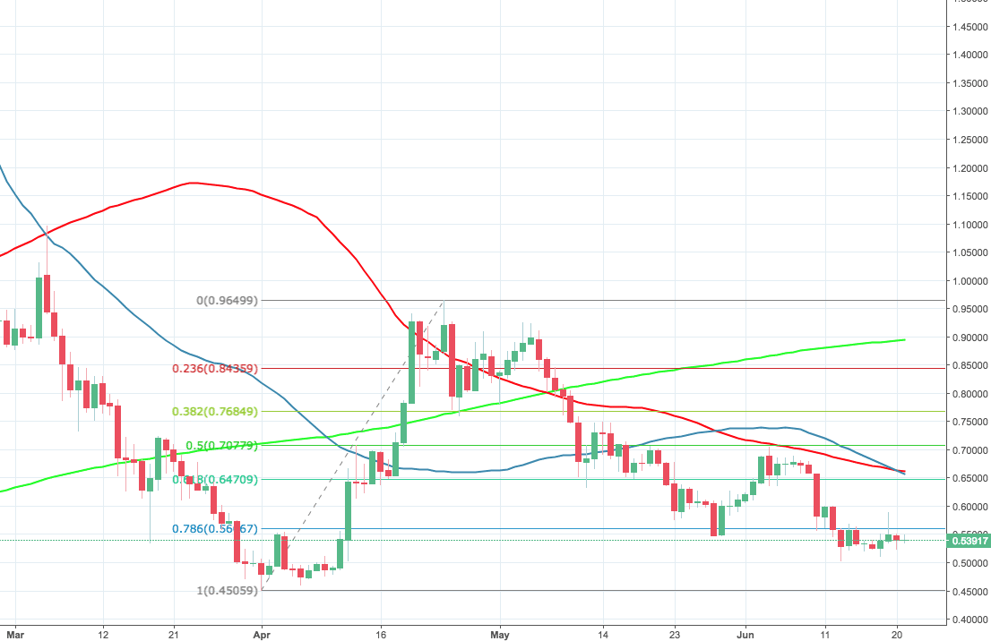 From the technical perspective, XRP/USD is rangebound with $0.5600 (which is 78.6% Fibo retracement level) creating a strong resistance, while the recent low at $0.5020 serves as a floor. A clear breakthrough in either direction will trigger a strong movement with the next strong obstacle located at $0.6470 (61.8% Fibo) followed by $0.6550, which is created by 50-DMA. On the downside, the ultimate bearish target at $0.4500, this is the lowest level of 2018, reached in April.