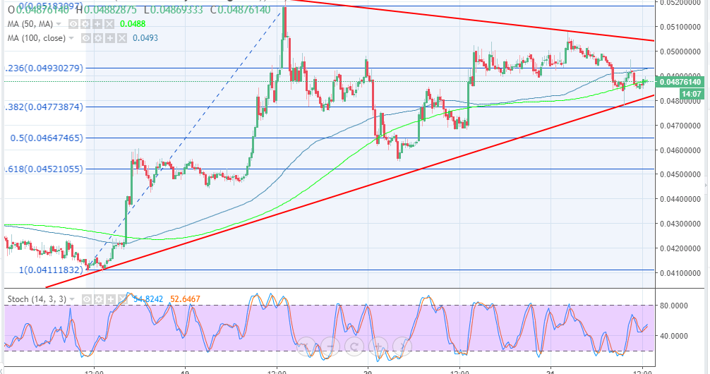 The stochastic is sending short-term bullish signals but the buyers lack the momentum to sustain upside movement. The 50 SMA is supporting the TRX/USD which is trading at $0.048, on the contrary, the 100 SMA is limiting gains as well as the 23.6% Fibonacci.