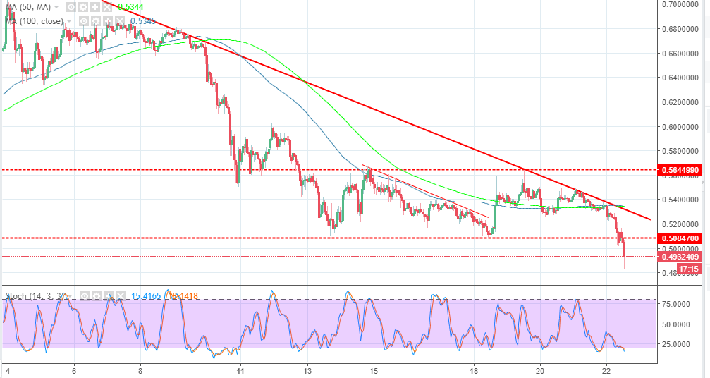 The cryptocurrency, which is ranked the 3rd by market capitalization, has sustained huge declines that it has broken below the ranging channel explored in the analysis on Thursday. The Bears are not done in spite of the extended declines. Moreover, technical indicators like the stochastic are in the oversold, but the sellers still ignore it. XRP/USD is exchanging hands slightly below $0.50. The 100 SMA has crossed to the upper side of the short-term 100 SMA indicating that the selling activity is high at the moment and will continue in the near-term. At the moment, the path of least resistance is to the downside, but in case of a trend reversal, the buyers will encounter resistance at $0.50 and $0.54 levels respectively.