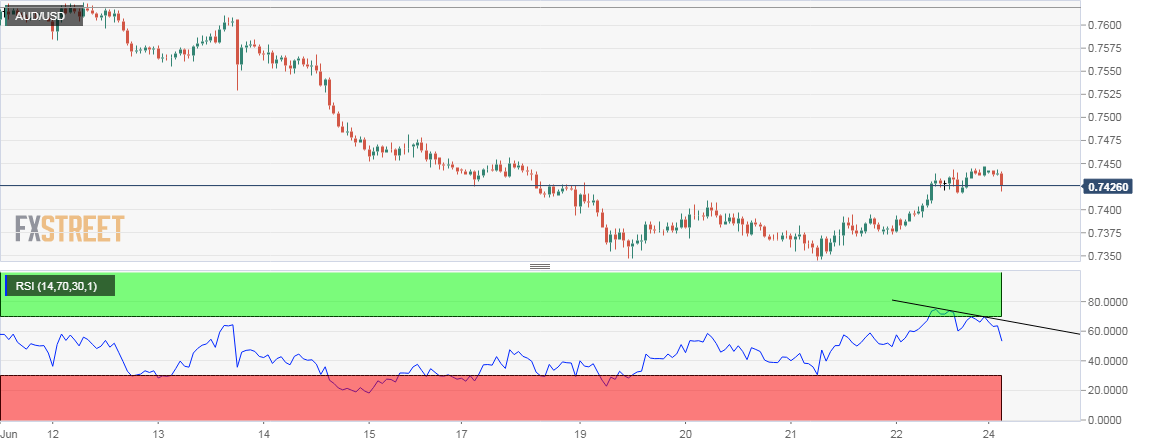 - The AUD/USD hourly chart shows a bearish price-relative strength index (RSI) divergence.