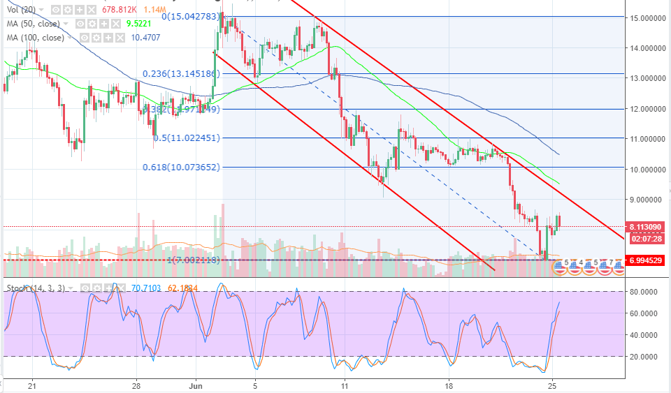 The Bears, on the other hand, are not done despite the extended declines. The upside has been capped below $8.5, moreover, the buyers are fighting for support at $8.00. EOS price is changing hands marginally above the immediate support at $8.00. There is a descending channel that has been limiting gains since the beginning of June. Similarly, EOS is still trading within the confines of the descending trendline.