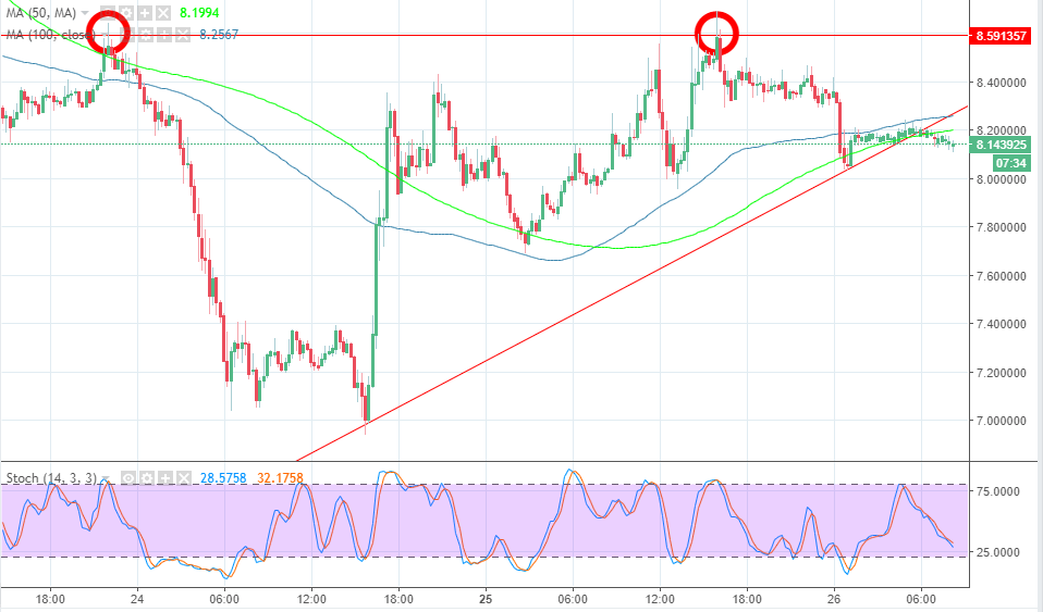 EOS price after trading a subtle double pattern has corrected lower sliding below the short-term support formed at $8.40. EOS/USD has also broken below the ascending trendline, however, it is still keeping the support above $8.00. The Bulls have the control but lack enough momentum to retrace the price higher. There are a couple of resistance areas created by the moving averages: The 50 SMA is limiting gains at $8.2 while the 100 SMA is offering resistance slightly above at $8.5.