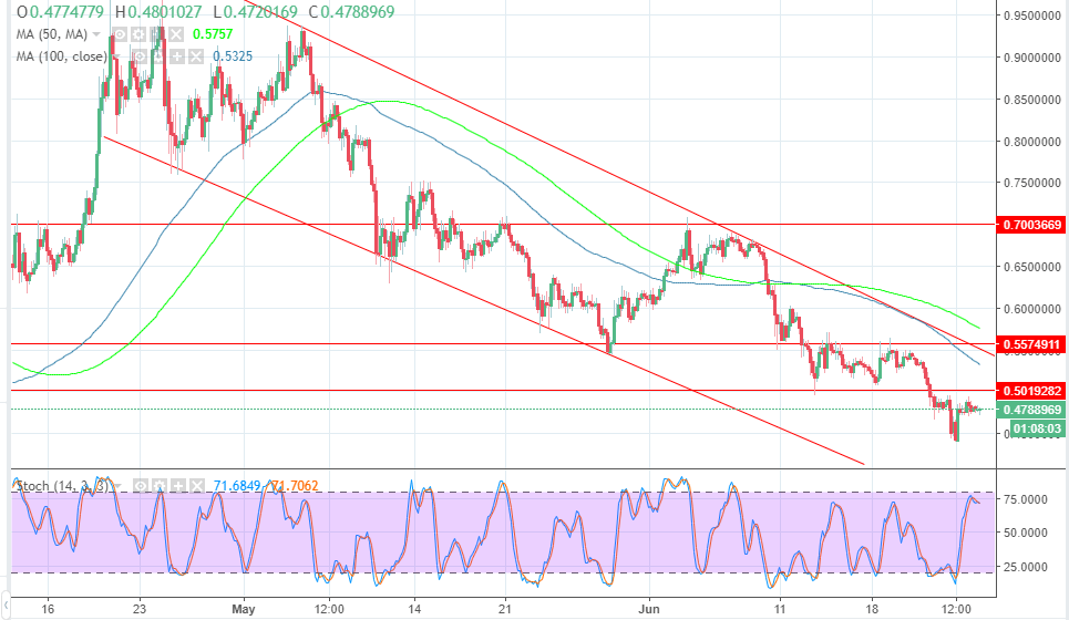 Ripple price has been hit by the selling pressure that dominated al the cryptos in the market since the beginning of the year. XRP/USD has been locked within a descending channel from April 20. The price has progressively traded lower highs and lower lows. The recent declines in the previous week sent Ripple price spiraling below $0.45. The third largest crypto is, however, battling to shake off the bears, but the upside has been capped below $0.50 for a few days now.