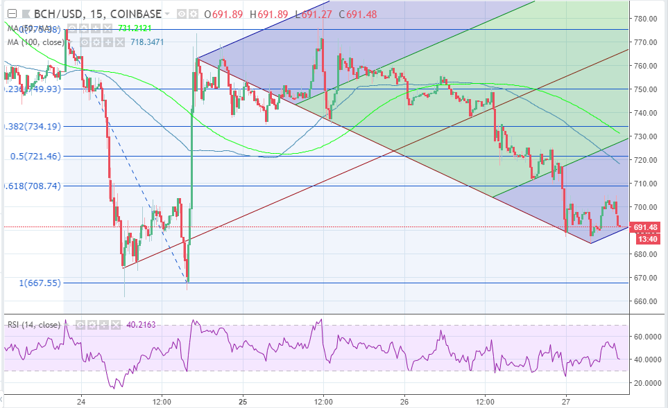 The price opened the session at $694.43 after rejecting the support from the 61.8% Fib retracement level with the last high leg of $775 and a low of $667.5. The upward movement initiated on Sunday could not break above the resistance at $770 and BCH/USD has been capped below this level since. The buyers must fight for a support above $680, this will prevent declines to the major support close to $670. The trend is, however, bearish at the moment. The Relative Strength Index is below the 40 mark and still heading south. The price is also trading below the moving averages whose gap is increasing signaling that the selling activity is growing in the short-term.