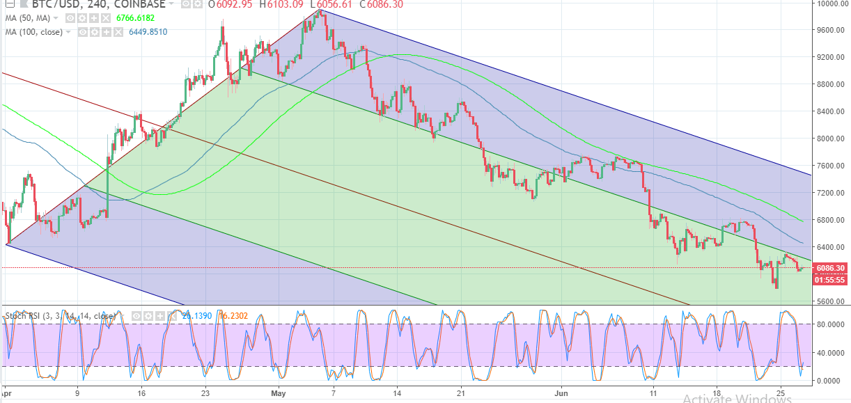 Bitcoin price is trading within the upper channel of Andrews Pitchfork with the base at $9,859 traded on March 12 while the upper pitch is at $9,894 traded on May 5 and the lower pitch is at $6,428 traded on April 1. After breaking the former support at $6,800 and $6,400, BTC/USD has been capped below $6,320. The digital asset succumbed to selling pressure below $6,000 and recorded lows of $5,777.
