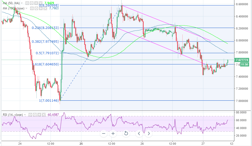 - The immediate resistance is at $7.8 (50% Fibo) but the buyers have their eyes glued on $8.00.