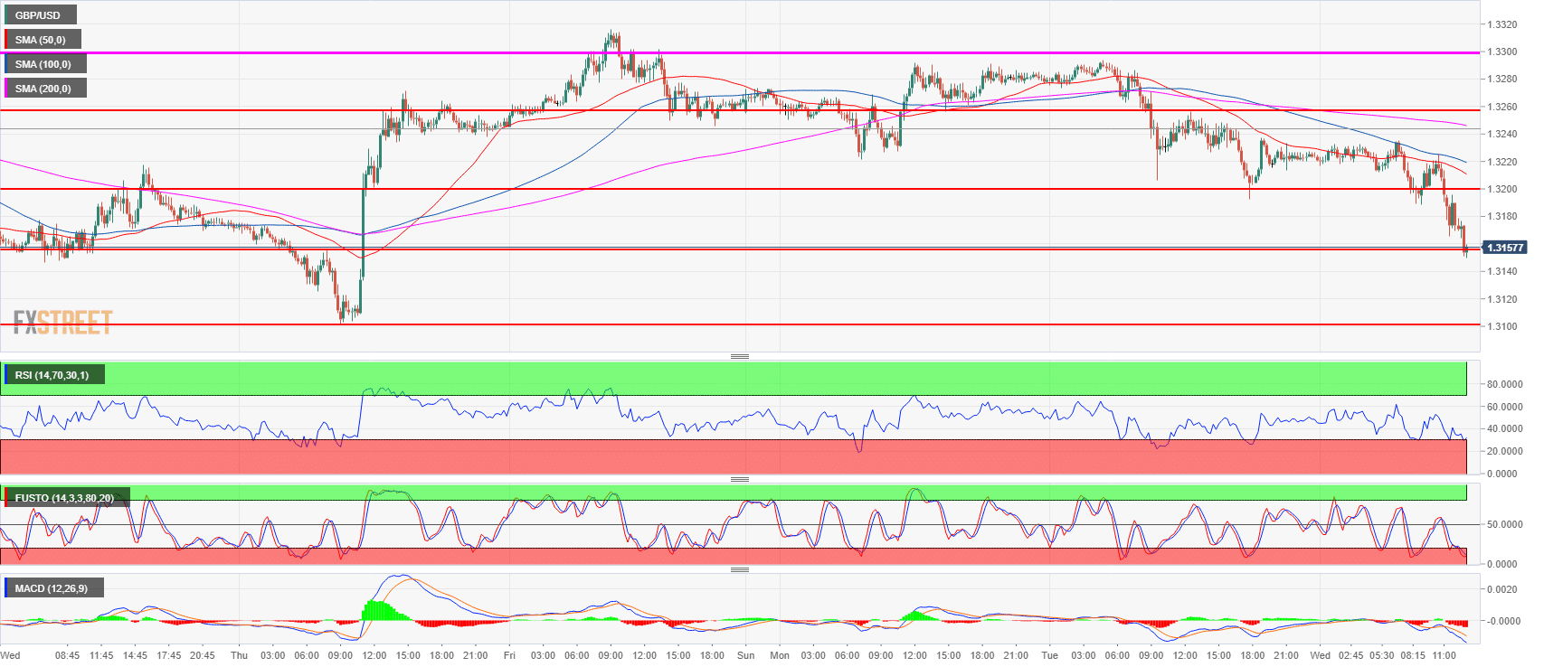 - GBP/USD is testing the 1.3155 level, the former breakout point. Cable momentum is bearish as GBP/USD formed a death cross, the 50-period simple moving average crossed below the 200-period SMA on the 15-minute chart.