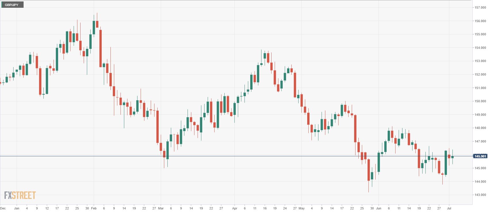 - GBP/JPY is trading just a little above Tuesday’s open, currently capped by the 146.00 figure and the 50-period simple moving average.