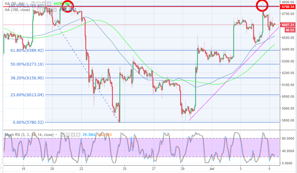 Bitcoin price traded the second top to complete a double-top pattern but ran out of the momentum to sustain the breach above $6,700. The price is trading slightly higher compared to the opening trade on Thursday which means that the trend is still bullish. A short-term support can be observed at $6,600, while the breakout position at $6,700 is still out of the intraday reach for now.