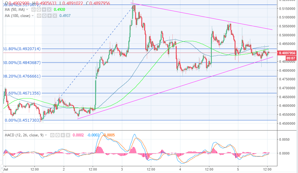 Ripple price lost momentum during the trading yesterday on July 4 after trading marginally above the critical resistance zone at $0.50. XRP/USD even broke below the 61.8% Fibonacci level with last swing high of $0.51 and a swing low of $0.451, although the short-term support at $0.485 came in handy. The upside is currently limited by the 50 SMA and the broken support at 61.8% Fibo.