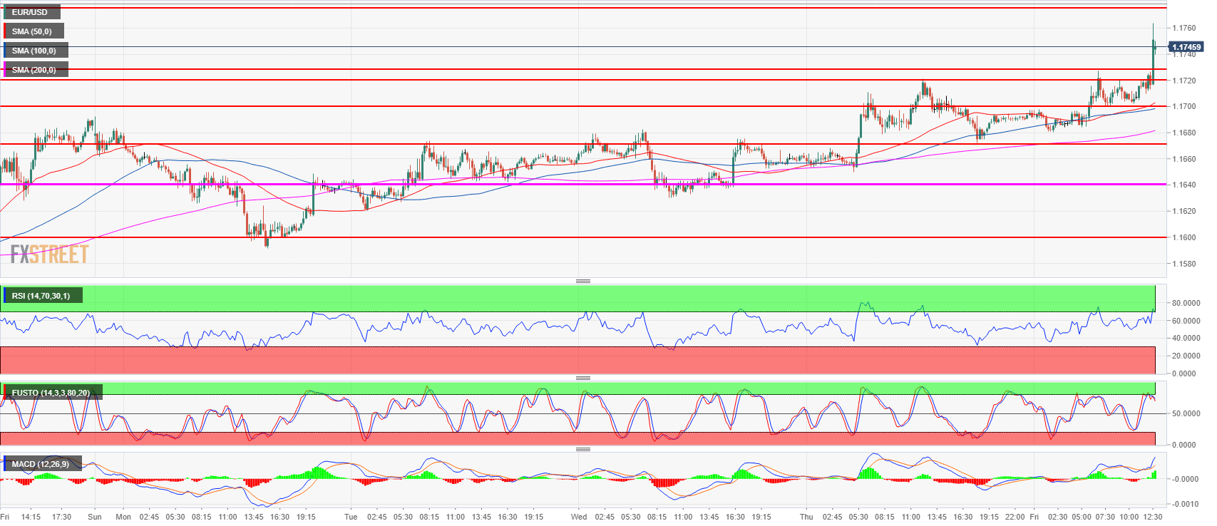 - EUR/USD broke above 1.1730, the 23.6% Fibonacci retracement from the mid-April-May bear move.