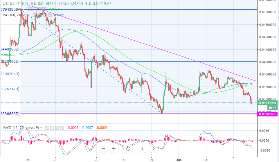 Tron price is hanging at the edge of a cliff at $0.035, the buyers lack a fresh catalyst to sustain higher corrections, while they are struggling to avoid further declines. There is a weak bullish momentum forming at the time of writing, similarly, the moving averages gap is narrowing to show that the buyers are seeking more entries. The MACD, on the other hand, is stuck in the negative regions signaling that the bears are not ready to give up control. On the upside, there will be tough resistance to be faced at $0.038 while the area at $0.040 is a critical level in the recovery towards $0.050.