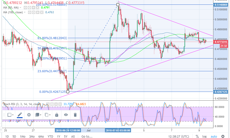 Ripple price is trading between the support by the 100 SMA at $0.4763 and the 50 SMA resistance at $0.4794. The trend is bullish at the moment, but the upside has been locked below $0.480. The price is also trading a contracting triangle, however, it is approaching a breakout that could culminate in an upward movement above the upper supply zone $0.50.
