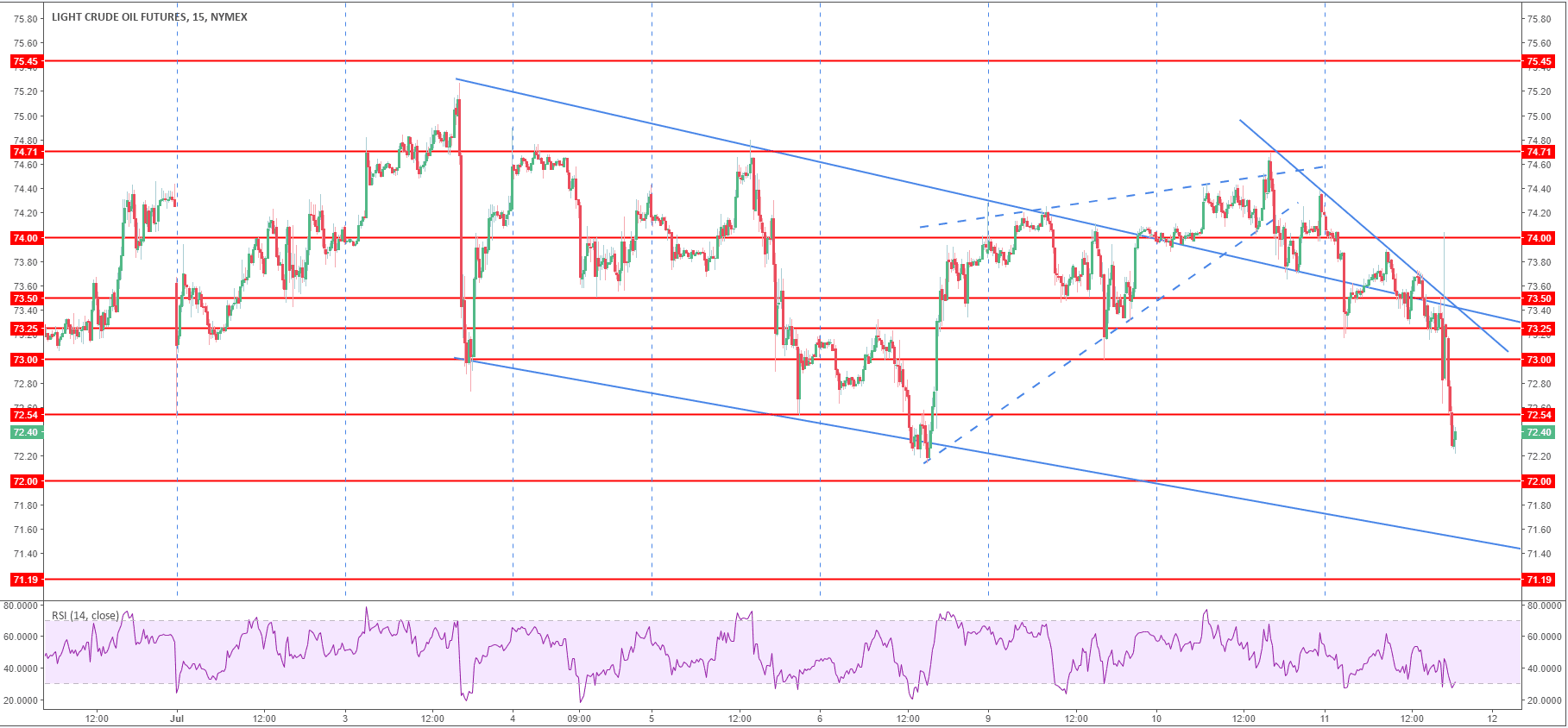 - Crude oil finally broke below $73.00 a barrel after two days of consolidation.