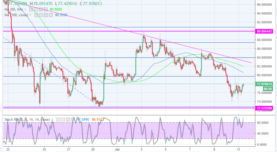 The stochastic is advancing further up, similarly, the RSI on the same 1-hour timeframe chart is pointing north to show that the buyers have the grip. The 23.6% Fibonacci retracement with the last high leg of $89.89 and a low leg of $72.75 will limit the movements towards the critical resistance zone at $80.00. There are a couple of more resistance zones highlighted by the moving averages, where the 100 SMA will limit the upside at $80.56 and the 50 SMA at $82.00 (upper supply zone).