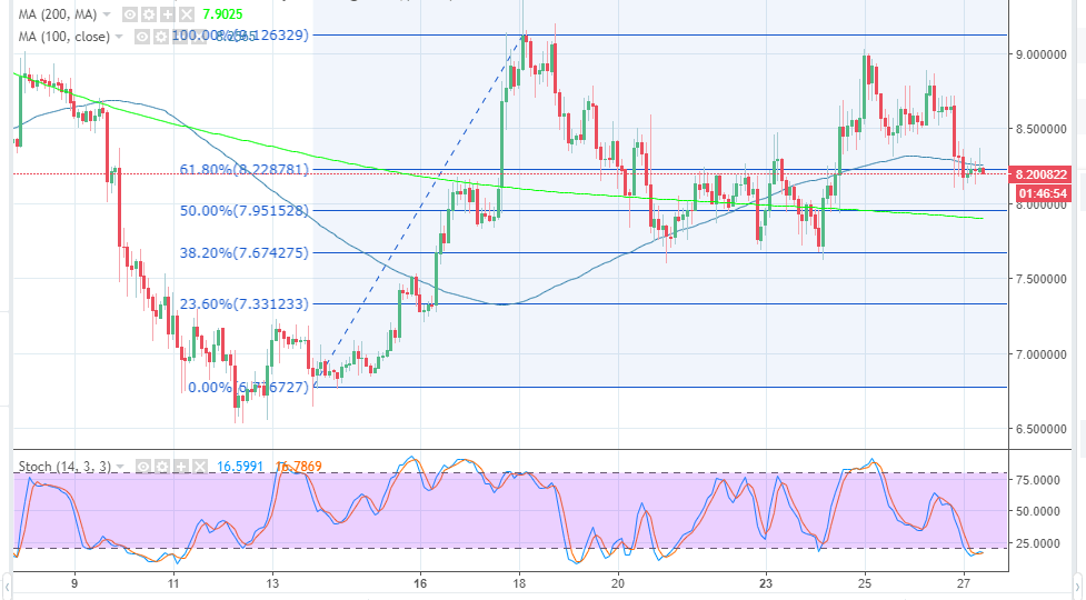 EOS is battling to find a balance at the 61.8% Fib level taken between the high of $9.12 and a $6.77 low close to $8.20. The price declines further yesterday, rejecting the short-term support at $8.5. EOS/USD is trading between the moving average support and resistance. However, the 100 SMA is above the 200 SMA showing that, the buyers still have momentum left to reverse the trend towards $8.5 (broken support).