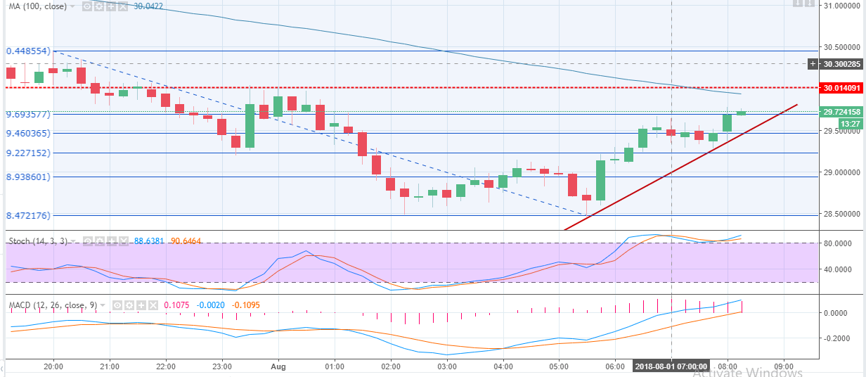 The technical indicators on the hourly chart are showing bullish signals for now and could stay the same way in the short-term. On the flipside, the fib levels between the highs of $30.44 and lows of $28.47 will offer short-term support in the event of a trend reversal but the major support sits at $28.00.