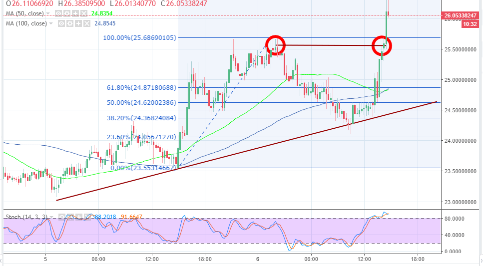 - Bitcoin Gold price cleared the resistance at $25.00; eyes are on $30.00 in the near-term.