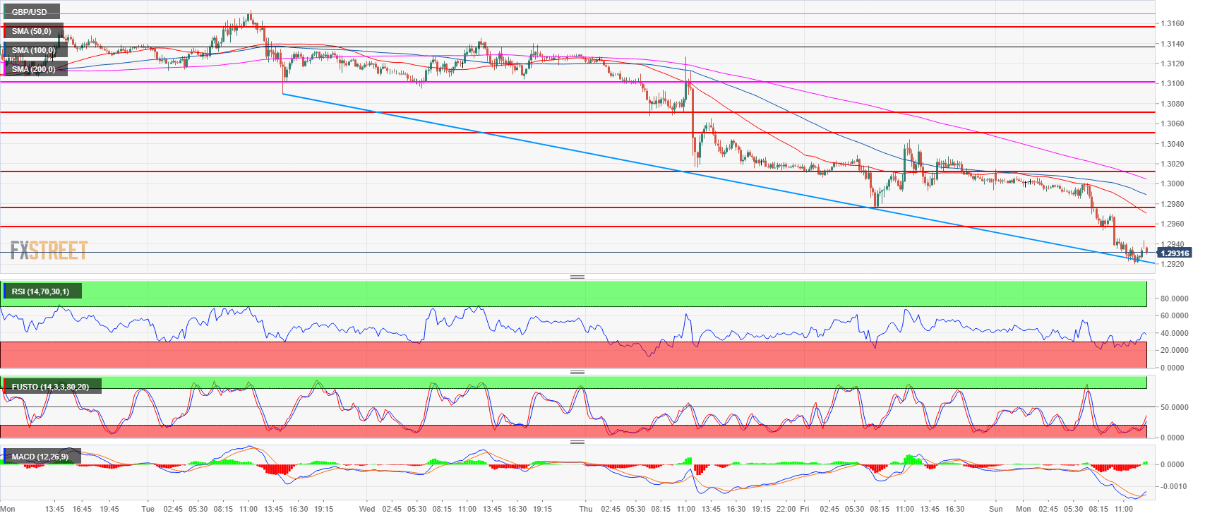 - GBP/USD is starting the week with an 80-pip sell-off to 1.2920 breaking below the former 2018 low at 1.2957.