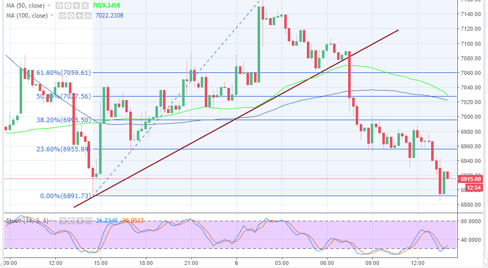 Bitcoin price extended the declines below the support level at $6,900. Although it is currently trading above this level, it has recovered from a dip supported at $6,880. There is a bullish trend at the time of writing, besides the technical indicators are showing bullish signals for the short-term. The stochastic is making its way out of the oversold region while the moving average gap is closing in on the 15-minutes timeframe chart. Resistance will be encountered at $6,930, moreover, there are a couple of critical supply zones at$6,940 and $6,980.