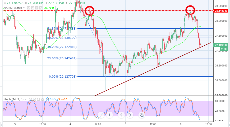 Over the weekend, the buyers staged a recovery using the support at $26.5 – $27.00. The price cleared the resistance at $27.5 on Sunday 5. In addition to that, NEO opened the trading today, Monday 6 with higher corrections above the resistance at $28.00. However, it has formed a double top pattern as observed on the chart leading to lower corrections that are currently canceling the gains made in the last few days.