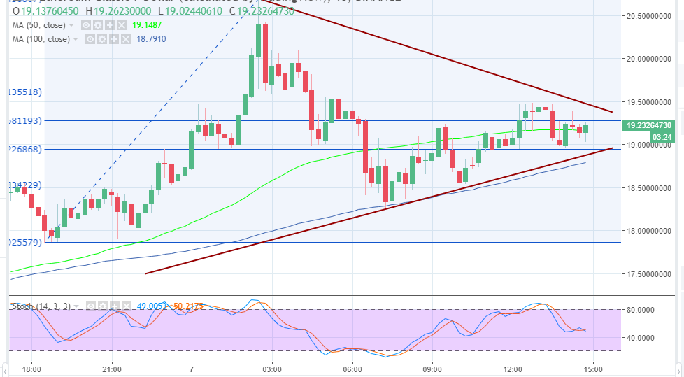 Ethereum Classic is trading a contracting triangle pattern, which means a breakout is close. A break above the $19.50 resistance will open the door for more upside correction above $20.00. However, if ETC/USD breaks the contracting triangle support at the 38.2% Fibo at $18.94, then the asset could breakdown towards the support at $18.00. In the meantime, a support above $19.00 is important to the buyers.