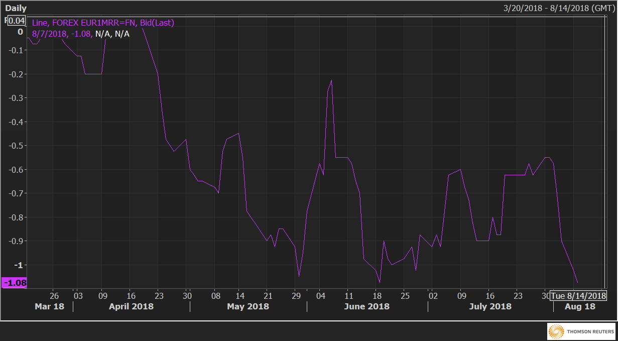 The one-month delta risk reversals (EUR1MRR) have dropped to -1.05 (the lowest level since June 19) vs -0.55 seen on July 31, indicating a pick-up in demand or implied volatility premium for the EUR puts (bearish bets).