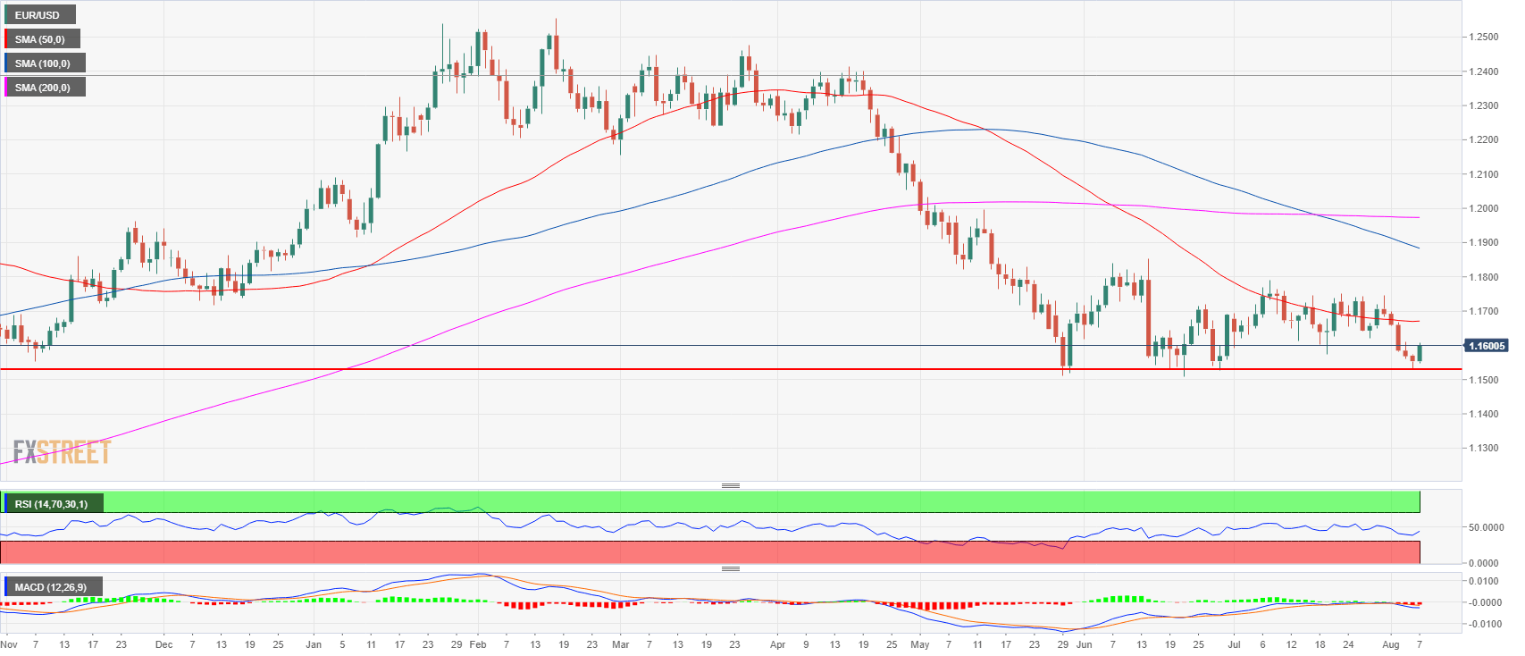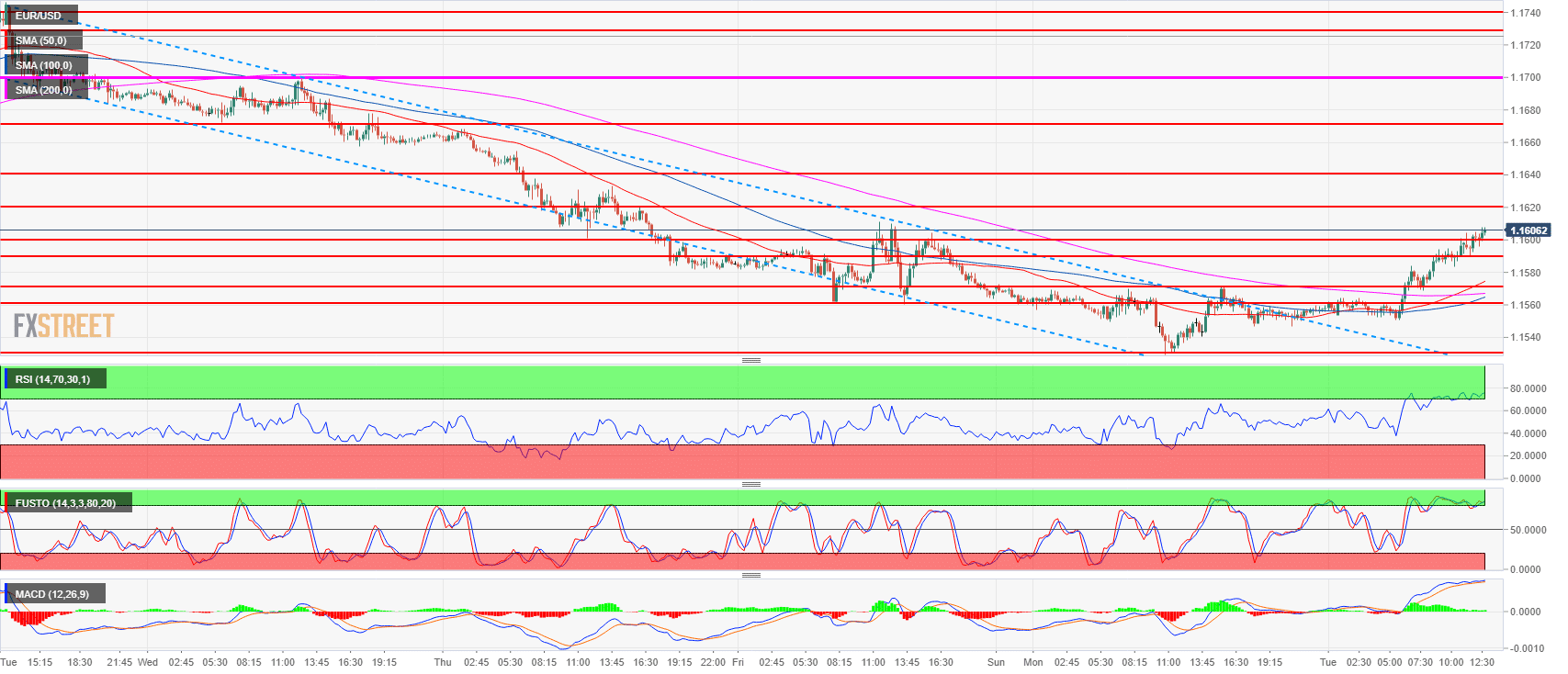 - The 50-period simple moving average has crossed above the 200-period SMA suggesting that the bullish momentum is intensifying. Bulls objective is to now to clear the 1.1620 resistance in order to drive EUR/USD towards 1.1640-1.1649 area.