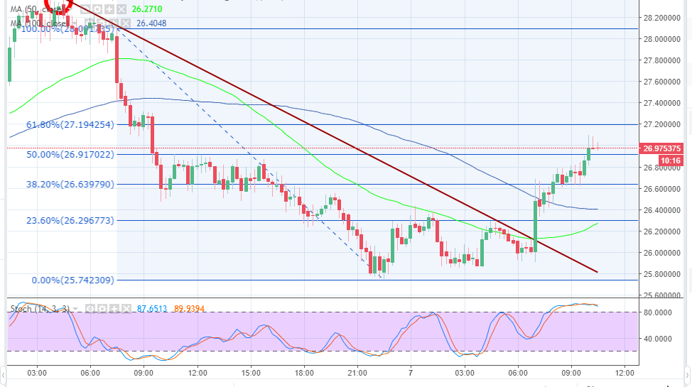 Although the 23.6% Fib retracement level of the last drop from $28.09 to low of $25.74 at $26.29 was limiting gains on Tuesday morning (GMT), the buyers with an intent to retrace higher, broke above the trendline resistance as well as the Fibonacci resistance. NEO/USD engulfing candle made it above $26.00 and $26.80 resistance respectively. At the time of writing, the price is trading above the 50% Fib level while the bulls have their eyes on $27.00 in the near-term.