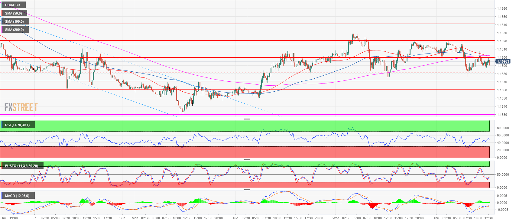 - EUR/USD is now trading below its 50, 100 and 200-period simple moving average suggesting that the bullish pressure is currently slightly diminishing. Bulls are having an advantage as long as the market stays above the 1.1571-1.1581 mark. A bull breakout above 1.1600-1.1620 area would likely lead to the second buy wave of the week.