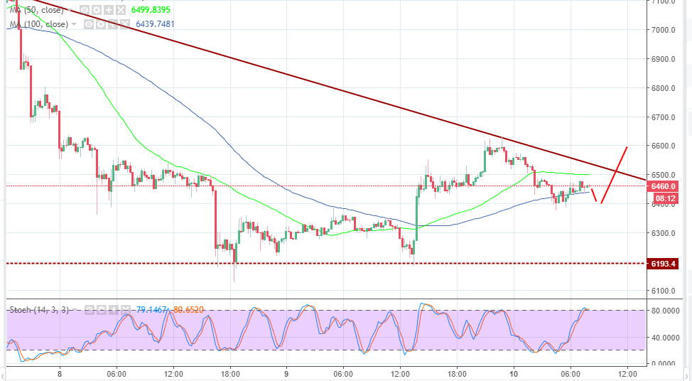 At the time of writing, Bitcoin is trading between the moving average support and resistance. Where the short-term 50 SMA is standing in the way of upside retracement at $6,500. On the other hand, the 100 SMA is offering immediate support at $6,438.8. The bullish trend in the afternoon (GMT) trading session on Thursday broke above $6,400, came into a struggle at $6,500 and later before the close of the session attacked $6,600, although failed to break above the resistance.