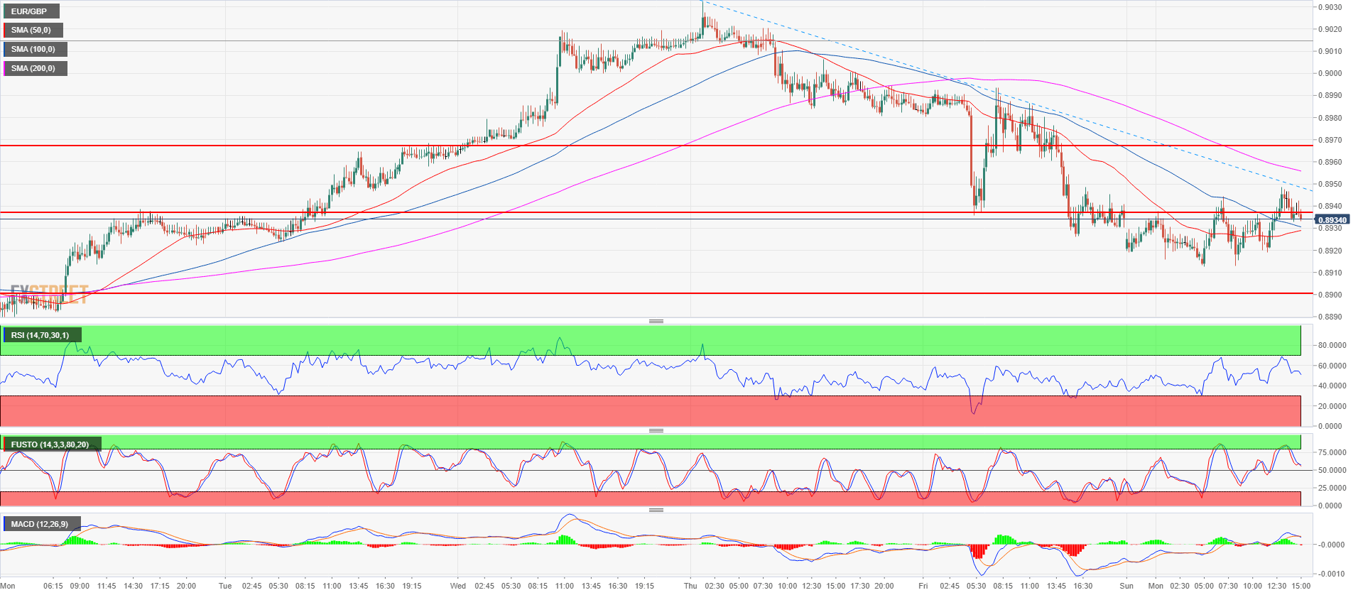 - EUR/GBP is trading above its 50 and 100-period simple moving average (SMA) on the 15-minute chart but bulls would need a cross-over of the 50 SMA above the 100 and 200 SMA in order to confirm the resumption of the bull trend. In addition, a breakout above the bearish trendline and 0.8957/67 area would further confirm the bullish bias.