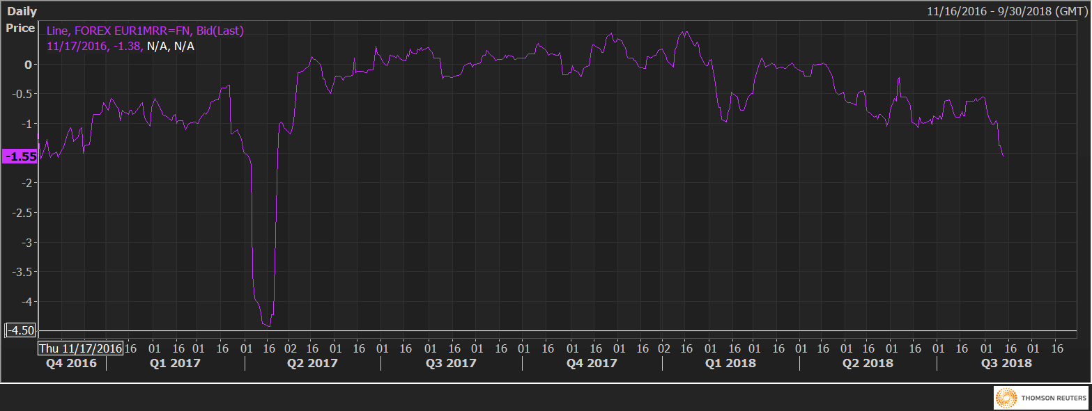 The options market has already prepared for a further sell-off in the EUR/USD. For instance, the EUR/USD one-month 25 delta risk reversals (EUR1MRR) dropped to -1.55 in Asia – the lowest level since April 2017, indicating a rising demand or rising implied volatility premium for the EUR puts.