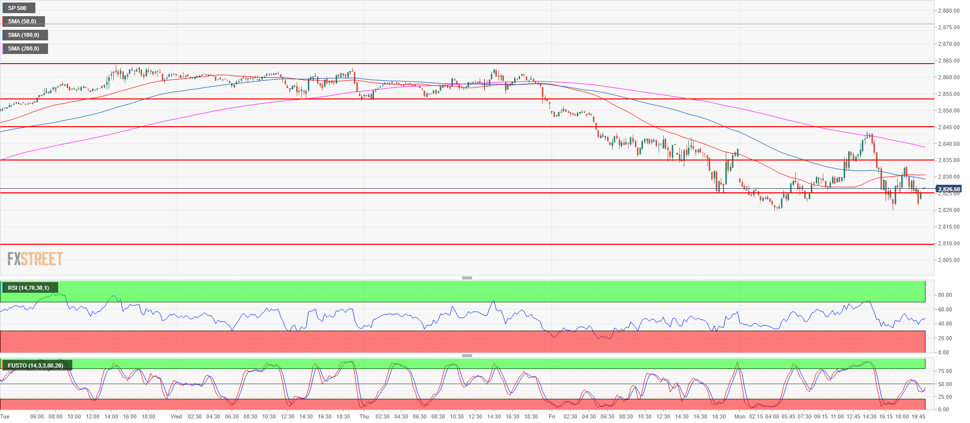 • The bulls tried to resume the bull trend on Monday but they were overwhelmed by bears at the 200-period simple moving average (15-minute chart) just below the 2,845.00 resistance.