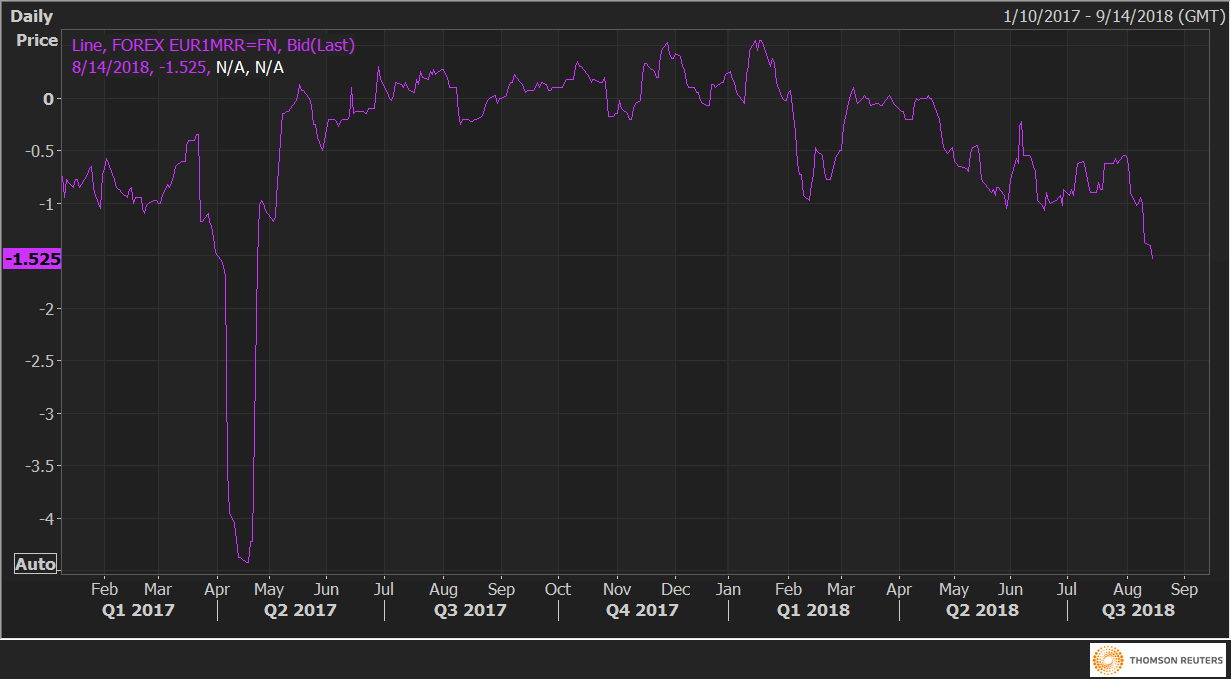 The EUR/USD one-month 25 delta risk reversals (EUR1MRR) hit a fresh 16-month low of -1.525 today, indicating the rising demand or the rising implied volatility premium for the EUR put options (bearish bets).